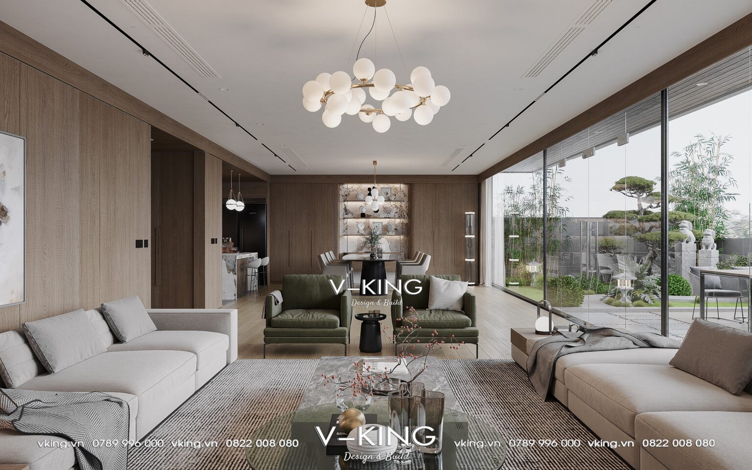 Sàn ốp gỗ là một lựa chọn tuyệt vời cho không gian nội thất hiện đại và tạo ra sự ấm áp và thoải mái. Tuy nhiên, Kiến trúc VKING đã lót thảm ở khu vực phòng khách giúp cho không gian trở nên đa dạng hơn. Điều này có thể giúp tạo sự cân bằng giữa sự ấm áp của gỗ và màu sắc thảm, đồng thời tạo sự đồng nhất về gam màu trong không gian phòng khách.