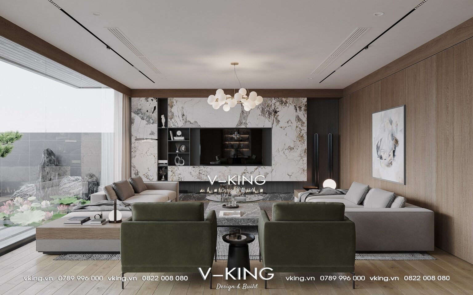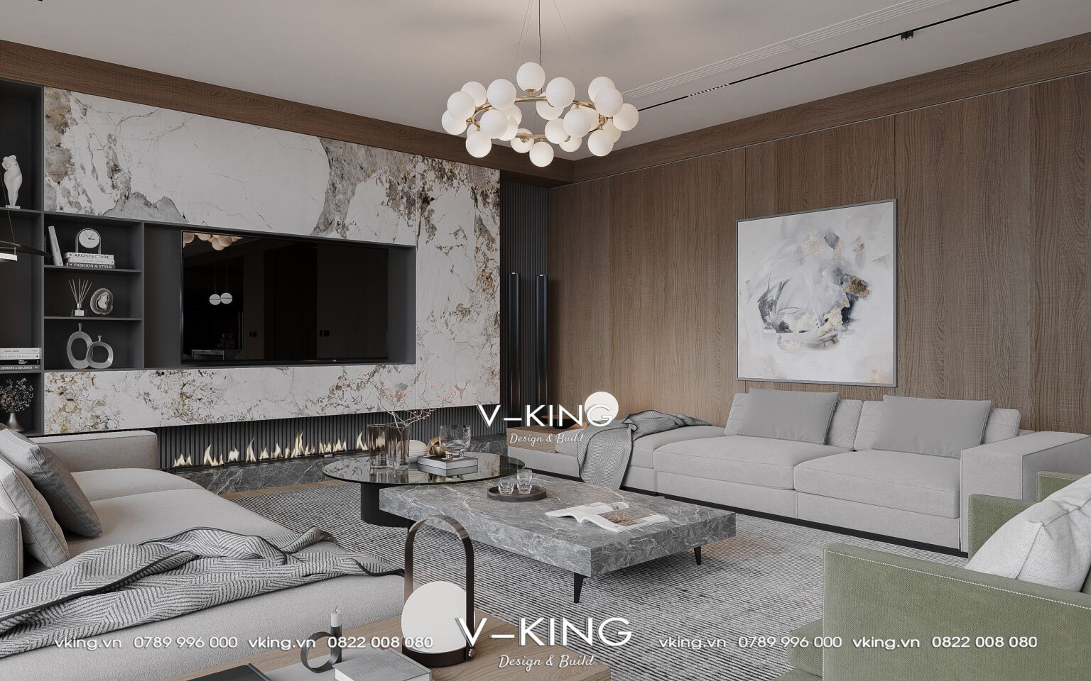 Từ cái nhìn đầu tiên, bạn sẽ bị cuốn hút bởi không gian phòng khách được thiết kế với sự tinh tế đặc biệt và tông màu xám sang trọng. Điểm nổi bật đáng chú ý nhất chính là diện tivi được ốp lớp đá tự nhiên và kết hợp tinh tế với lam sóng, tạo nên một sự hài hòa và sự độc đáo rất riêng. Bên cạnh TV, không gian còn được tận dụng thông minh để tạo ra các ngăn đựng trưng bày, tạo nên một không gian tuyệt vời để trưng bày những vật phẩm giá trị hoặc đơn giản là để sắp xếp những cuốn sách thú vị.