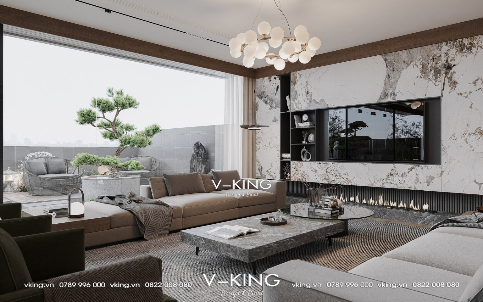 Bàn trà sofa đôi trong thiết kế của Kiến trúc VKING là một ý tưởng độc đáo mang đậm phong cách nội thất hiện đại. Một trong những điểm nổi bật chính ở đây là sự kết hợp giữa hai mặt bàn khác nhau – một bên là mặt đá Ceramic và bên kia là mặt kính.