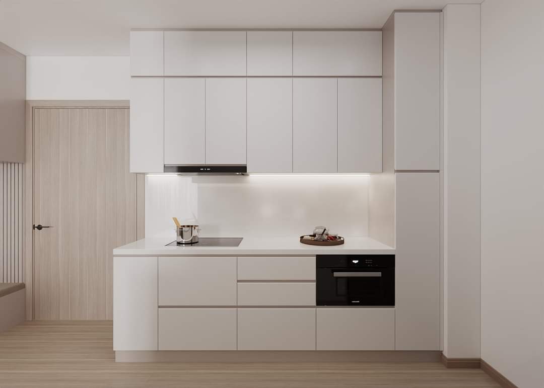 Màu sắc nhã nhặn của gỗ An Cường kết hợp với mặt bàn bếp đá trắng tạo nên một không gian bếp hiện đại, sạch sẽ. Các thiết bị nhà bếp như lò nướng, lò vi sóng, và bếp từ được tích hợp thông minh, giúp tiết kiệm không gian và tạo sự thuận tiện tối đa cho người sử dụng.