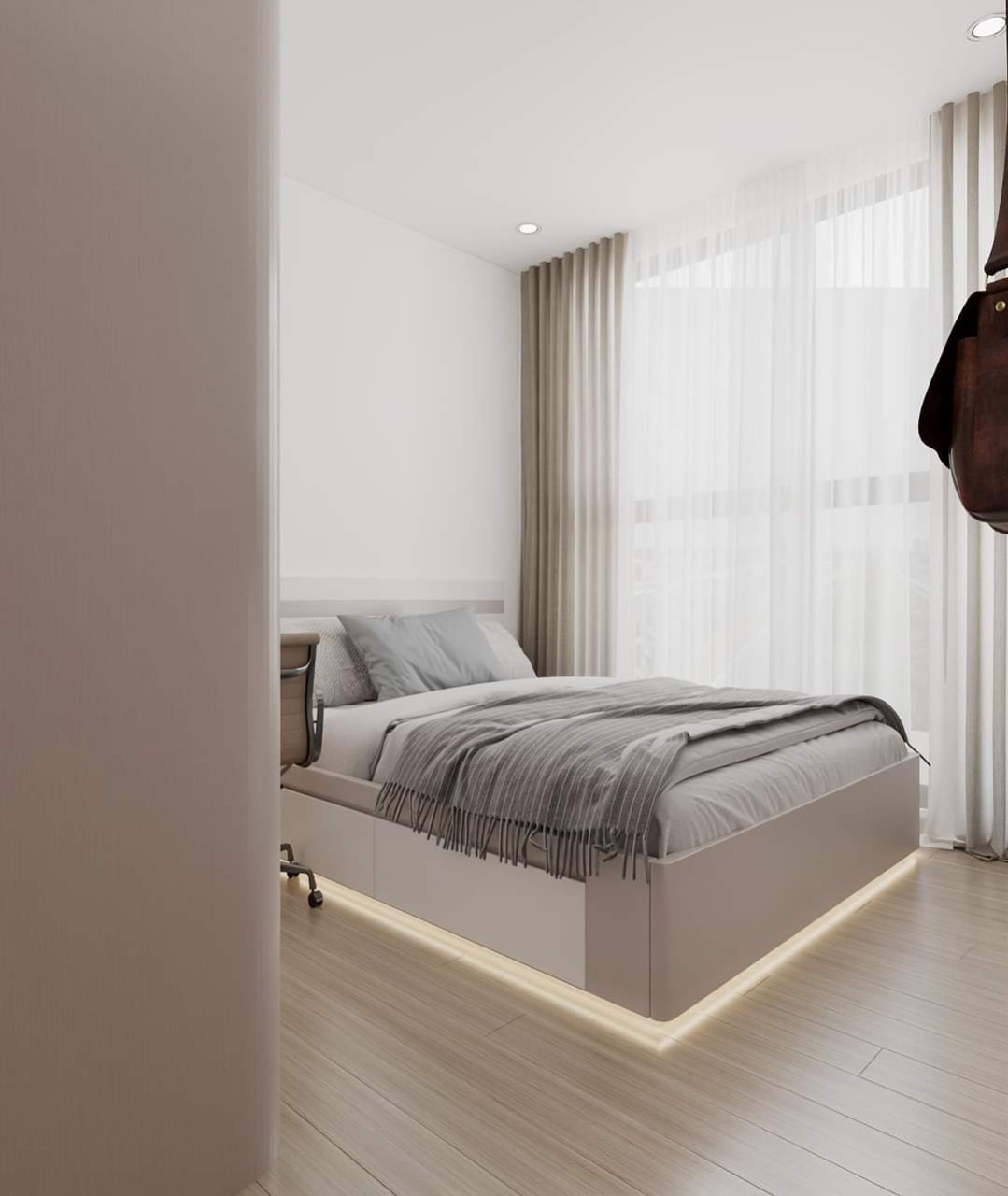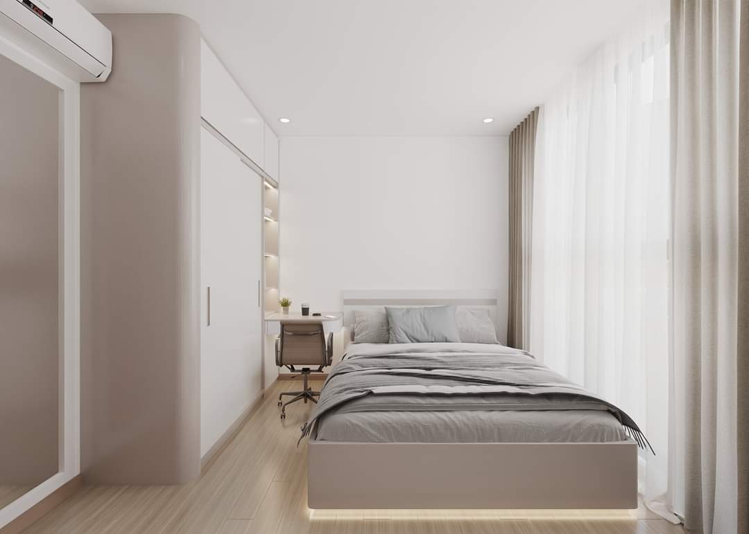 Phòng ngủ, dù có diện tích khá nhỏ, nhưng được thiết kế thông minh để tối ưu hóa không gian sử dụng. Giường ngủ tích hợp ngăn kéo lưu trữ bên dưới giúp giải quyết vấn đề lưu trữ đồ đạc. Tủ quần áo âm tường, bàn làm việc nhỏ gọn và kệ sách được bố trí hợp lý, giúp phòng ngủ trở nên gọn gàng và ngăn nắp. Sự kết hợp giữa tông màu trắng be và các chi tiết nội thất đơn giản tạo nên một không gian nghỉ ngơi thoải mái, thư giãn.